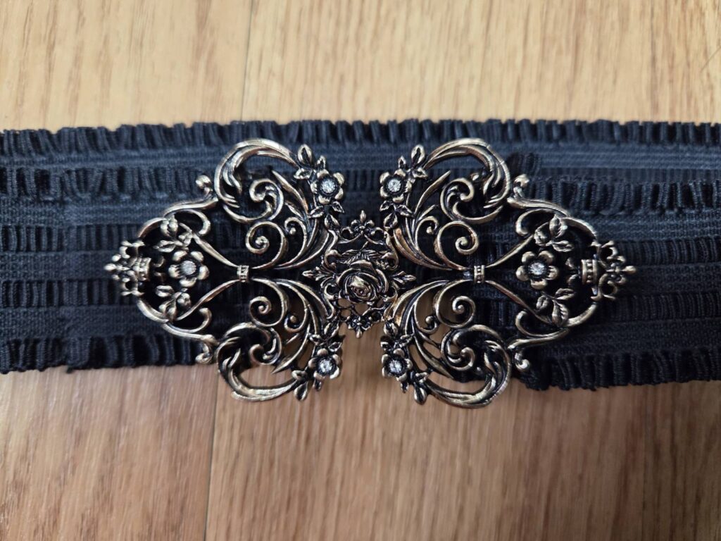 ・ベルト: ここでアンティーク調バックルのベルトを投入!ウエストをキュッとマークすること